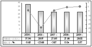 氟康唑是合成的氟代三唑類(lèi)化合物,同樣由美國(guó)輝瑞公司研制,1990年在美國(guó)上市,很快成為暢銷(xiāo)新藥,2003年銷(xiāo)售額達(dá)到11.76億美元的高峰。目前已上市20年,仍是抗真菌重要品種之一。據(jù)美國(guó)輝瑞公司年報(bào)顯示,2009年該公司氟康唑的全球性銷(xiāo)售額為3.34億美元,同比上一年下滑10.46%(見(jiàn)圖4)。國(guó)內(nèi)已有多家生產(chǎn)廠商仿制生產(chǎn)氟康唑。2011年最新數(shù)據(jù)顯示SFDA已下發(fā)314張生產(chǎn)批文,10家制藥企業(yè)生產(chǎn)氟康唑原料藥。國(guó)內(nèi)氟康唑主要?jiǎng)┬陀凶⑸湟骸⒎坩槃、膠囊、片劑、分散片、顆粒劑、氣霧劑和葡萄糖、氯化鈉注射液。臨床上使用較多的品牌是輝瑞公司進(jìn)口藥! 圖4 近五年全球七大藥品市場(chǎng)氟康唑銷(xiāo)售分析