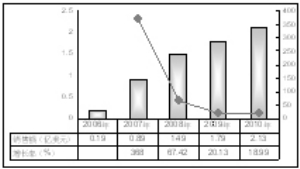 另一個(gè)棘白菌素類(lèi)抗真菌藥物是米卡芬凈,由日本安斯泰來(lái)公司研制開(kāi)發(fā),2002年首次在日本上市,2005年3月獲得美國(guó)FDA批準(zhǔn)在全球上市,2006年得到兒童適應(yīng)證的批復(fù),同年在中國(guó)獲批上市。因耐受性良好、療效確切而成為市場(chǎng)潛力良好的品種。、2009年,日本安斯泰來(lái)公司米卡芬凈全球銷(xiāo)售額為2.38億美元,同比上一年增長(zhǎng)了32.96%(見(jiàn)圖8)。 圖8 全球七大藥品市場(chǎng)米卡芬凈銷(xiāo)售分析