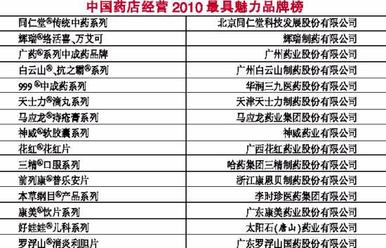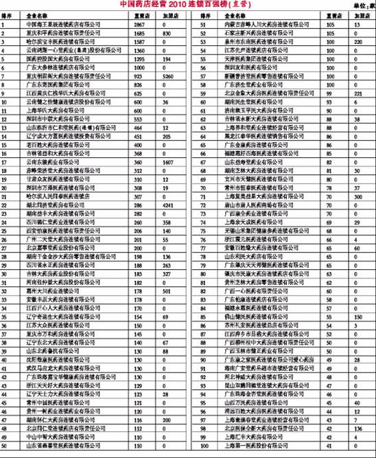 由國家食品藥品監(jiān)督管理局南方醫(yī)藥經(jīng)濟研究所和中國非處方藥物協(xié)會等單位組織的中國藥店經(jīng)營2010排行榜系列評選活動,依托國內(nèi)權(quán)威的醫(yī)藥信息研究機構(gòu),經(jīng)過半年多的調(diào)研最終形成了《中國藥店經(jīng)營2010連鎖百強榜(直營)》(截止統(tǒng)計時間為2010年7月31日)。在調(diào)研數(shù)據(jù)的基礎(chǔ)上, 組織機構(gòu)還邀請了零售專家和連鎖領(lǐng)導(dǎo)對品種、品牌和人物等進行審評,形成了系列榜單:《中國藥店經(jīng)營2010最具魅力藥品榜》、《中國藥店經(jīng)營2010最具魅力品牌榜》、《中國藥店經(jīng)營2010最具魅力人物榜》。