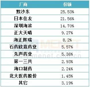 國(guó)產(chǎn)與進(jìn)口平分秋色 據(jù)HDM數(shù)據(jù)分析,2016年國(guó)內(nèi)醫(yī)院碳青霉烯類抗生素市場(chǎng)由21家公司激烈角逐。進(jìn)口藥物主要是美國(guó)默沙東、日本住友、日本第一三共、韓國(guó)Yungjin Pharm和JW Pharmaceutical Corporation等6家公司,合計(jì)占據(jù)了50.40%的份額。 國(guó)內(nèi)企業(yè)是深圳海濱制藥、正大天晴藥業(yè)、海正輝瑞公司、石藥集團(tuán)歐意藥業(yè)、先聲藥業(yè)等15家公司,占據(jù)著49.60%的市場(chǎng)份額。 重點(diǎn)城市醫(yī)院市場(chǎng)碳青霉烯類抗生素TOP10競(jìng)爭(zhēng)廠商
