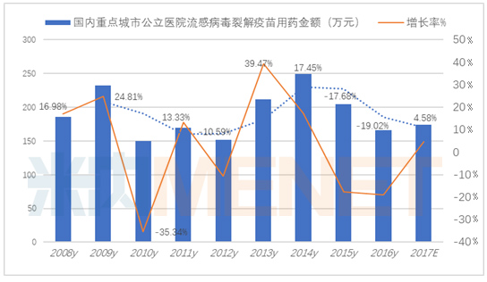 狂犬疫苗的接種人群特點(diǎn)與其他疫苗有所區(qū)別,主要用于緊急預(yù)防,是二類疫苗中競爭激烈的品種,而多采用雙保險注射狂犬免疫球蛋白,也成為最受中間環(huán)節(jié)關(guān)注的品種。國內(nèi)公立醫(yī)院狂犬病疫苗市場數(shù)據(jù)僅是冰山一角,國內(nèi)市場約在百億元左右,尤其是城市二級醫(yī)院保健科、衛(wèi)生防免站、縣級醫(yī)院和農(nóng)村衛(wèi)生院占據(jù)了較大比重。 肺炎球菌多糖疫苗市場起伏跌宕 流感病毒威脅著人類健康,是導(dǎo)致多種繼發(fā)性疾病的源頭,成為了免疫力低下者的連環(huán)殺手,2017年重點(diǎn)城市公立醫(yī)院流感病毒疫苗市場同比上一年增長4.58%,多年來流感病毒疫苗表現(xiàn)出起伏跌宕的走勢。