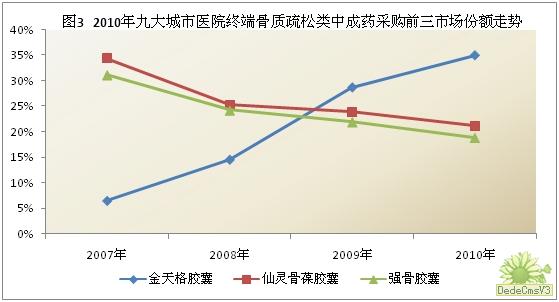 2010年九大城市醫(yī)院終端骨質(zhì)疏松藥市場前三位產(chǎn)品總的市場份額(CR3)達(dá)到75%,市場集中度極高。其中陜西金花企業(yè)(集團(tuán))股份有限公司的金天格膠囊以35%市場份額位居榜首,其次是貴州同濟(jì)堂制藥有限公司的仙靈骨葆膠囊,以21%的市場份額位居第二,緊跟其后的是占有19%市場份額的北京岐黃制藥有限公司生產(chǎn)的強(qiáng)骨膠囊。